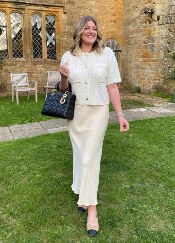 Cropped jackets have that old-school vibe but when you style one with satin, it feels fresh. Flats and a light handbag finish it off without overdoing it.