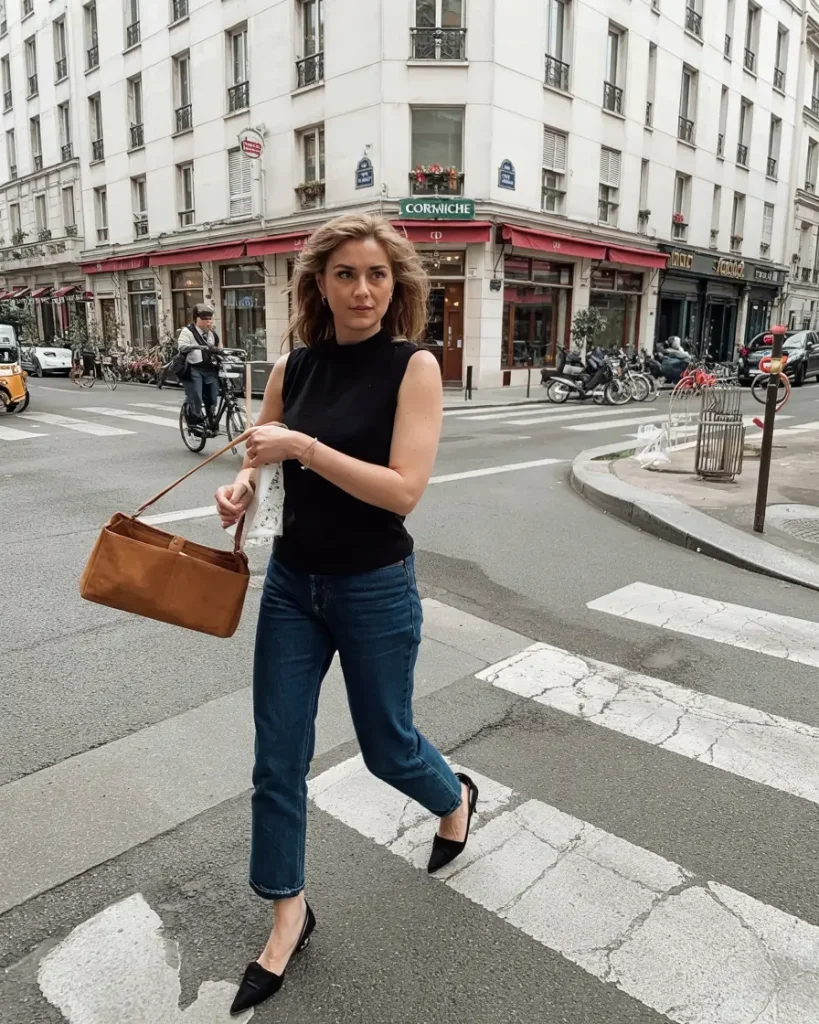 A sleeveless black top with clean denim is simple, polished, and versatile. Pointed flats add elegance while keeping the look relaxed.