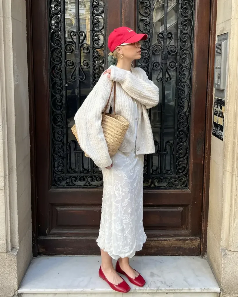 A textured cream cardigan over a white embroidered dress pairs coziness with playful romance. Red flats and accessories introduce vibrancy, creating a lively Cute Spring Dinner outfit that transitions effortlessly from day to night.
