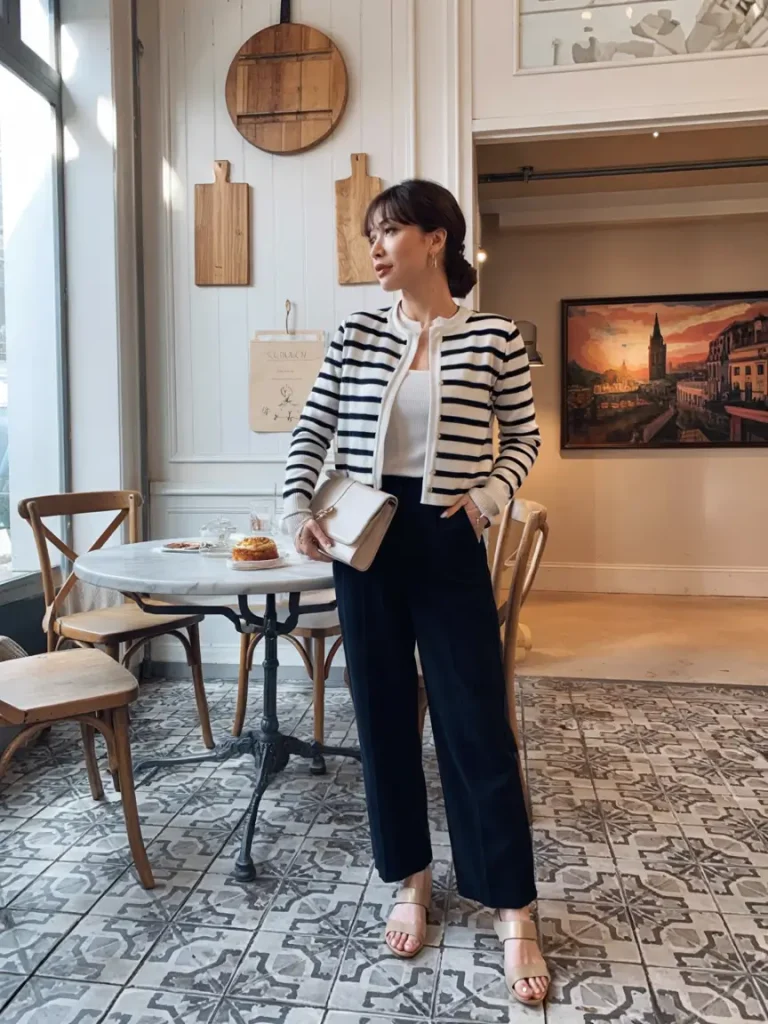 A striped cardigan over a white top with tailored navy trousers presents a timeless and Parisian-inspired look. Nude sandals and structured accessories add sophistication while remaining comfortable for spring evenings.