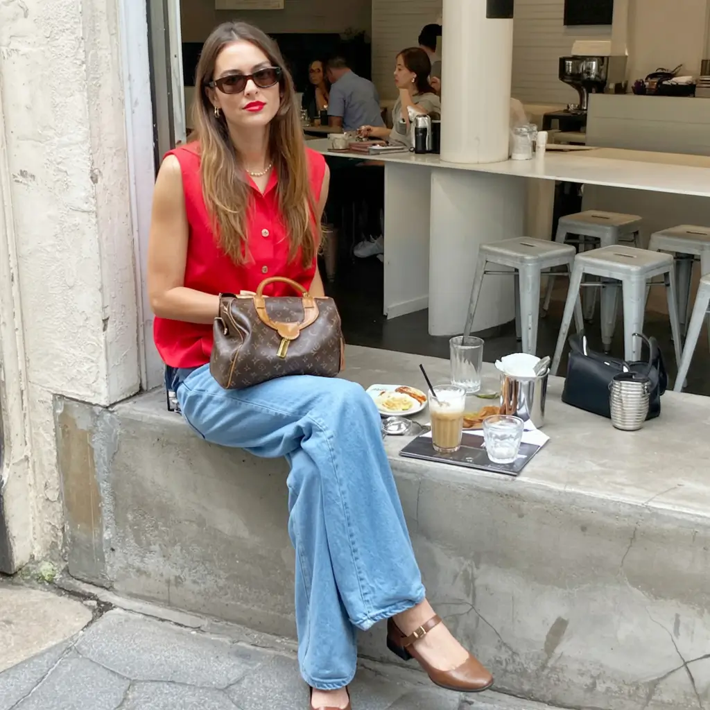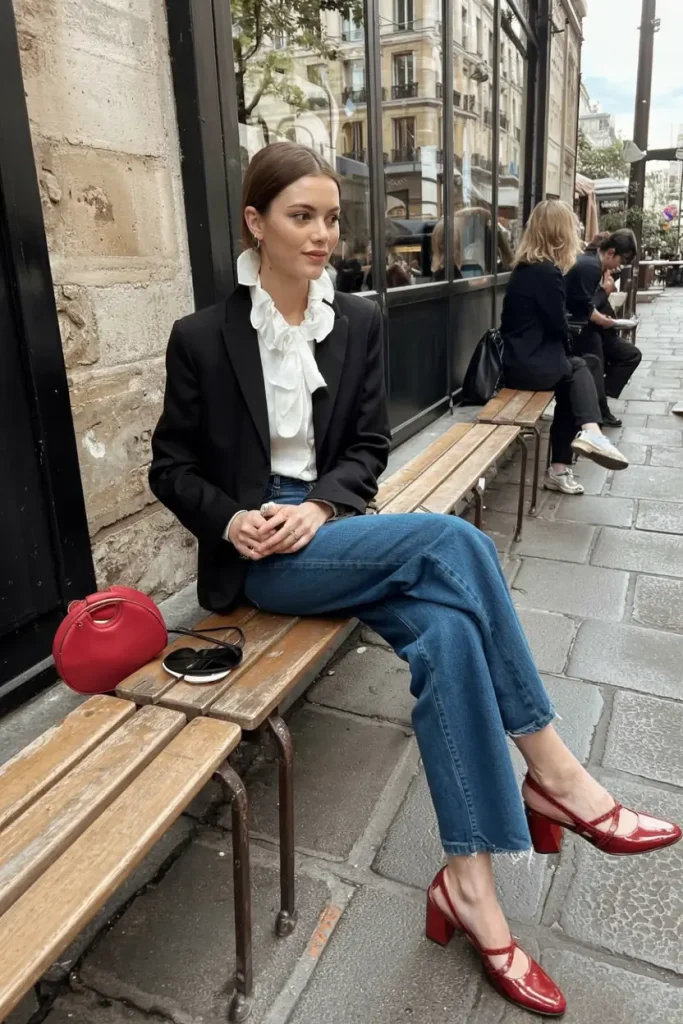 A sleeveless red blouse with light-wash jeans creates a vibrant, approachable combination. Brown Mary Jane heels add warmth and cohesion, making it ideal for casual spring dinners with personality.