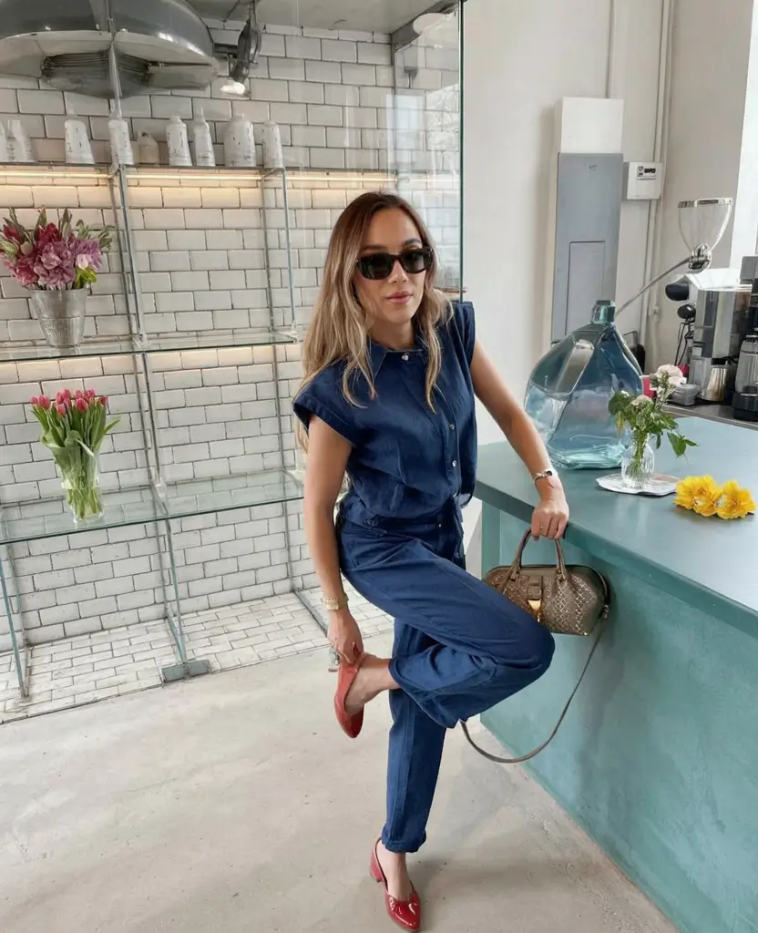 Matching denim pieces create a cohesive, modern silhouette. Red flats provide contrast, while simple accessories enhance this streamlined Cute Spring Dinner outfit.