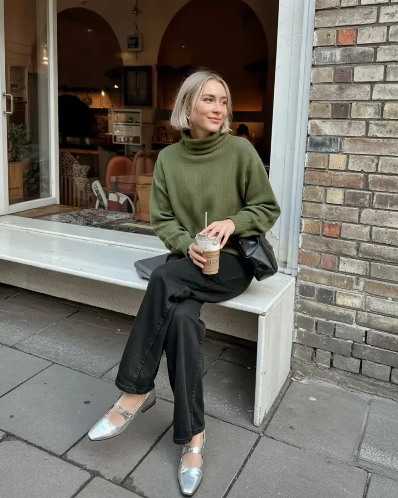 A soft green turtleneck with black trousers and metallic shoes blends comfort and subtle shine. Each piece adds texture and dimension, ideal for cooler spring evenings.