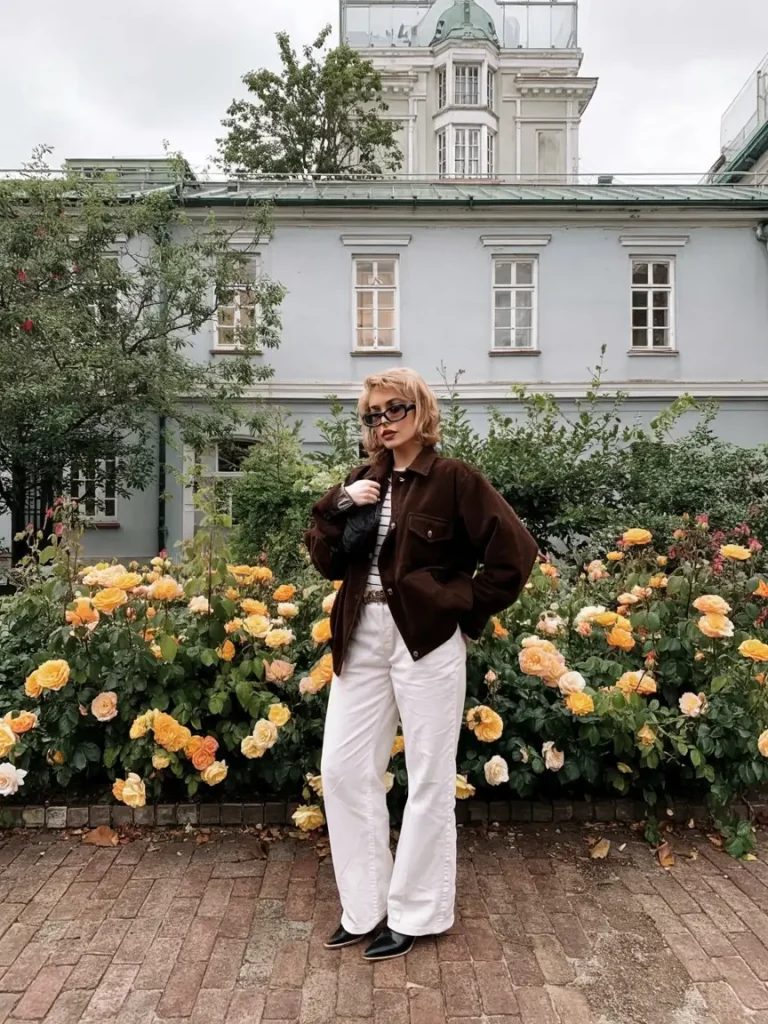 Deep brown with bright white offers a grounded, sophisticated look. A structured jacket, wide trousers, and pointed shoes provide polish while remaining approachable for spring dinners.