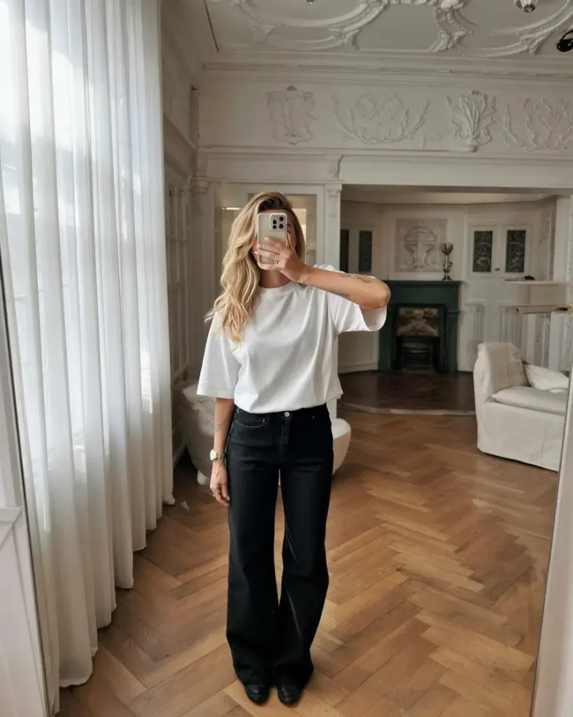 A white tee with black wide-leg jeans is minimal and versatile. The relaxed fit keeps it comfortable, while the monochrome palette delivers understated elegance for dinner evenings.