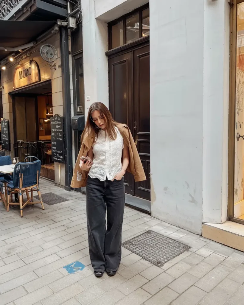 A lace blouse with dark wide-leg jeans and a camel jacket blends femininity and structure. Each piece works in harmony to create a refined, wearable Cute Spring Dinner outfit.