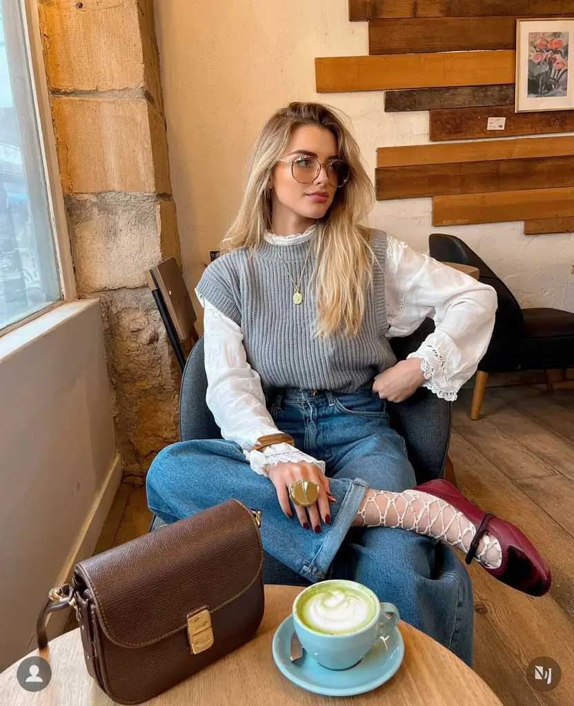 A knit vest layered over a lace-trimmed blouse with denim delivers texture, personality, and approachable charm. Burgundy-toned shoes and a structured bag create a balanced, stylish ensemble suitable for 2026 spring dinners.