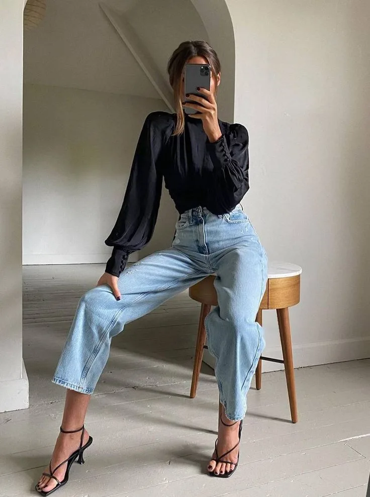 Blending simplicity and sophistication, this outfit works well for a low-key yet stylish birthday dinner. A black long-sleeve blouse with soft voluminous sleeves provides subtle drama, while high-waisted light-wash jeans keep the look modern and relaxed.