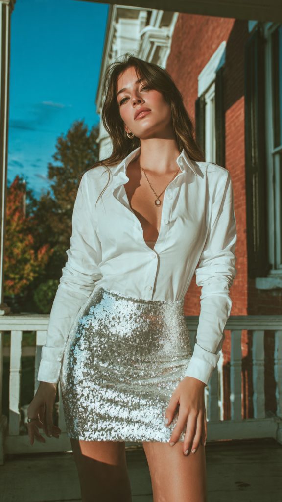 Pairing a maxi sequin skirt with a crisp white button-up shirt tucked in creates a refined and glamorous look. Ideal for New Year’s Eve, fancy birthdays, or girls’ night out, this outfit pairs perfectly with white heels.