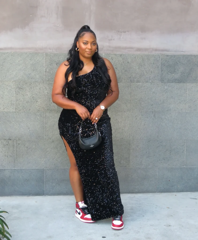 A black one-shoulder sequin gown paired with classic red-and-white sneakers creates an unexpected yet stylish contrast. This combination merges red carpet elegance with casual comfort, offering a chic and approachable Trending Sneaker Ball Outfit.