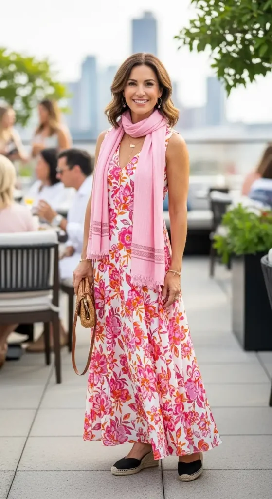 Flowy maxi dresses in soft prints or pastel shades create a relaxed and elegant silhouette. A lightweight scarf draped over the shoulders adds warmth and a polished finish, ideal for outdoor brunches. Neutral sandals keep the look light and comfortable.