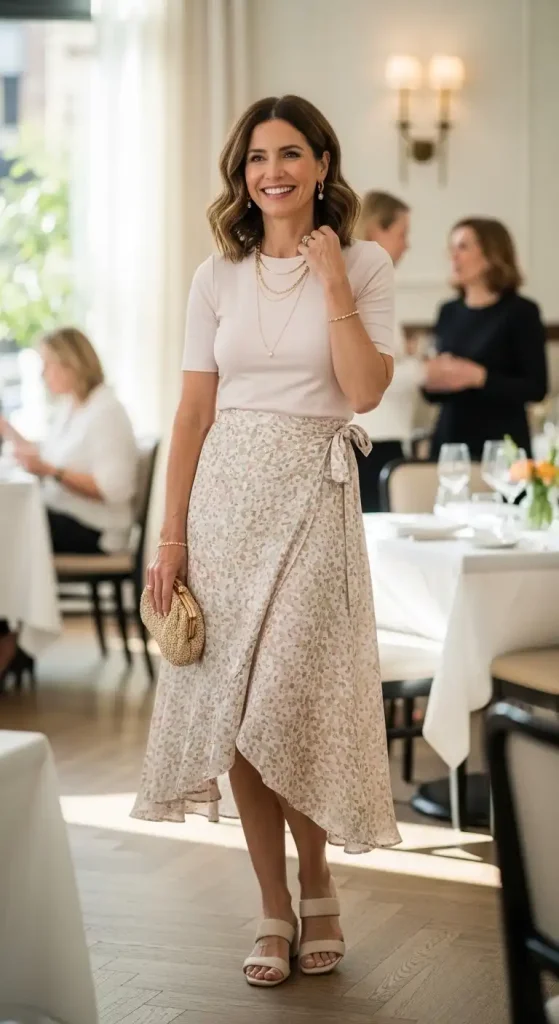 A wrap skirt with a fitted tee creates a soft and feminine silhouette. Choose spring-inspired prints or pastel shades for a seasonal feel, and pair with neutral or complementary footwear like sandals or loafers.