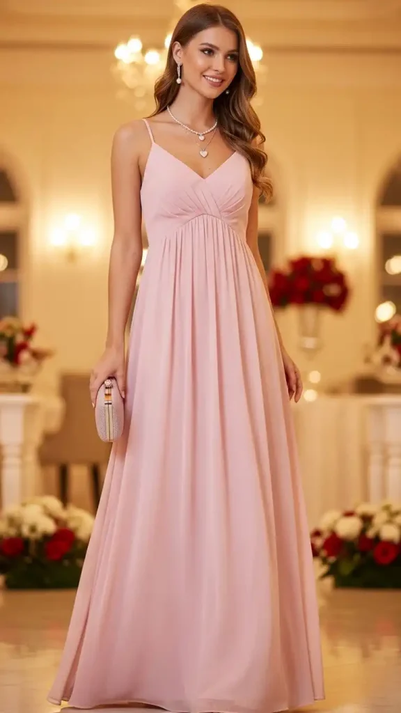 Choosing soft, flowy fabrics allows easy movement throughout the evening. Pairing the dress with classic heels helps create a polished and graceful silhouette.