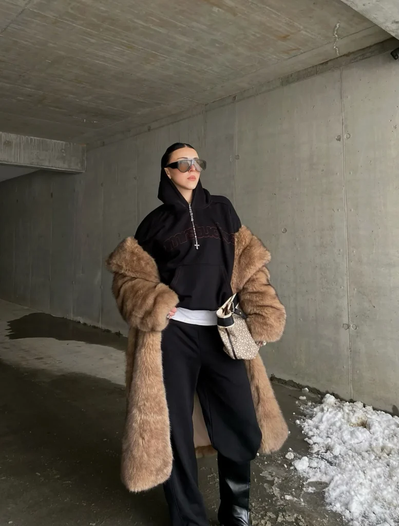 Layering a hoodie under a faux fur coat creates a chic, off-duty look ideal for brunch. The mix of relaxed and luxurious pieces makes the outfit feel intentional. Neutral colors keep the ensemble polished, and adding a structured bag balances the casual layers perfectly.