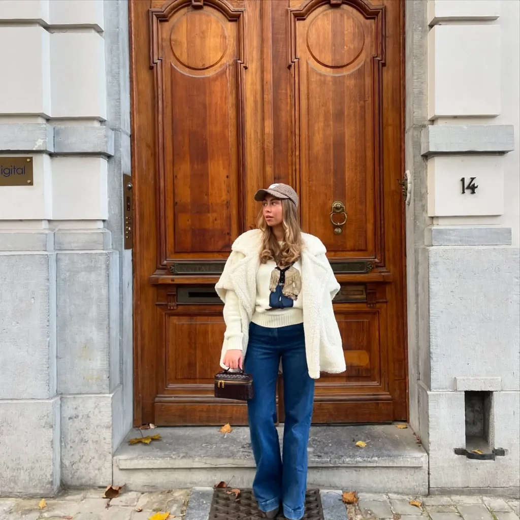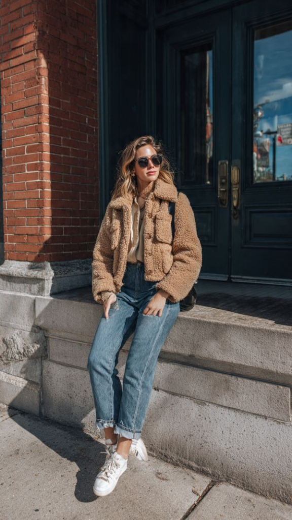 A teddy or shearling jacket is perfect for a winter brunch outfit. It provides warmth without feeling bulky and pairs beautifully with classic straight-leg jeans. Keep the rest of the outfit simple with a knit top and winter boots. This combination is casual, comfortable, and effortlessly stylish.