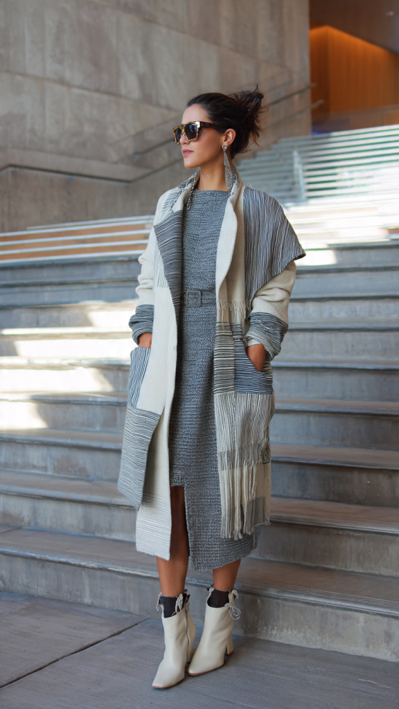 Layering a structured coat over a midi dress makes for a sophisticated winter brunch outfit. The combination of warm outerwear with a flowy dress creates balance between comfort and elegance. Stick to classic shades like camel, gray, or black, and finish with boots or loafers for a polished daytime look.