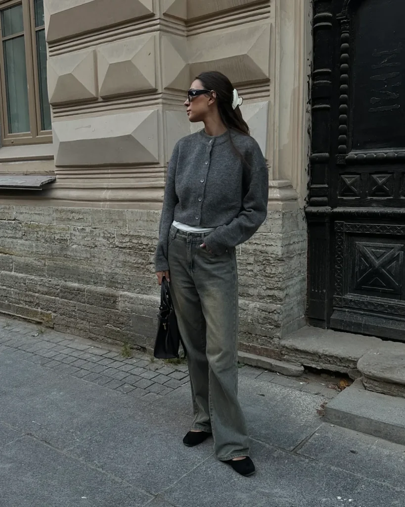 Pairing a cardigan with relaxed-fit jeans creates a timeless, casual winter brunch outfit. This look is perfect for milder winter days or indoor brunch plans. Neutral colors make styling easy, and ballet flats or loafers complete the outfit effortlessly.