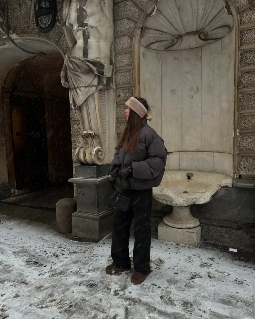 A cropped puffer jacket with wide-leg trousers offers a modern, cozy winter brunch outfit. This pairing works well on colder mornings while still keeping a structured silhouette. Neutral or earthy tones elevate the look, and loafers or chunky boots complete the outfit for a polished daytime feel.