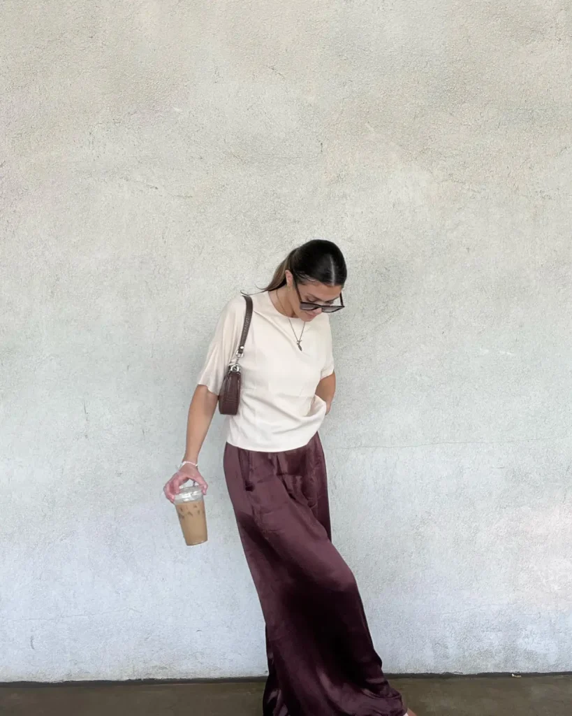 A satin midi skirt instantly brings elegance to any winter brunch outfit. Pair it with a soft knit or lightweight sweater for a look that is both cozy and polished. Neutral tones like cream, taupe, or charcoal make this outfit feel timeless and modern. Complete the look with sleek flats or ankle boots for an effortless daytime vibe.