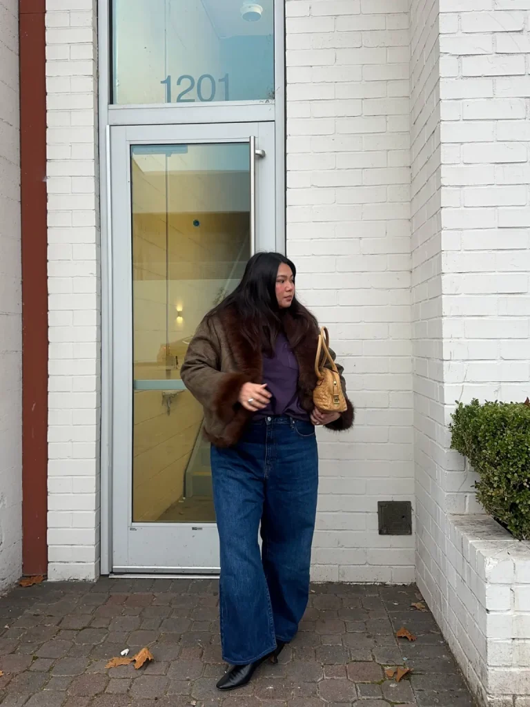 A plush faux fur jacket instantly elevates a denim outfit. This winter brunch outfit works well for plans that may include errands or coffee hopping. Keep the layers underneath simple so the jacket stands out, and finish with ankle boots or loafers for a refined touch.