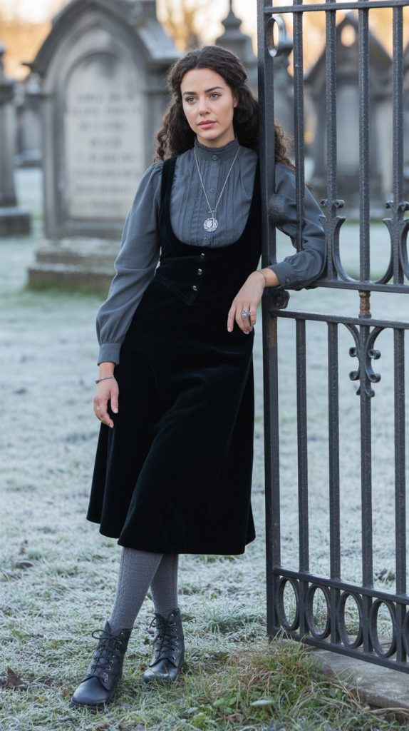 A serene and timeless Witchcore Winter Outfit, featuring a grey blouse under a black velvet pinafore dress. Silver jewelry adds subtle mystique, and layered textures of velvet, wool, and cotton create a balanced, reflective, and elegant winter style suitable for peaceful outdoor walks.