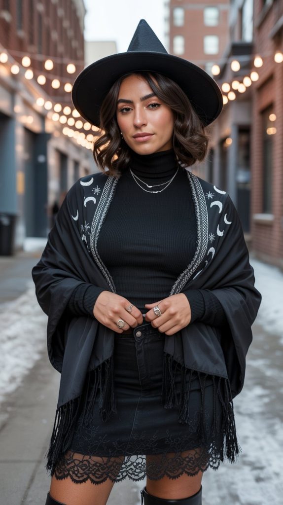 This modern Witchcore Winter Outfit merges boldness with everyday wearability. A wide-brimmed hat adds effortless attitude, while the black turtleneck and skirt provide a simple foundation. The shawl decorated with moons and stars introduces a mystical element, creating a versatile ensemble for snowy walks, coffee dates, or town outings.